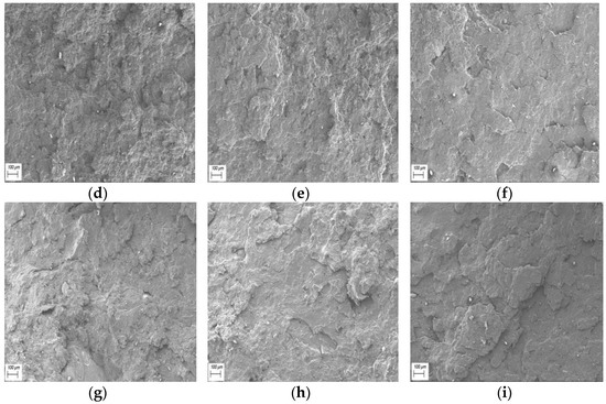 By increasing the VR amount in the blends, the surface becomes smoother and more similar to the reference surface structure. 75 wt% VR and S1-2%-E (f) hardly differ compared to 100% VR. 25 wt% and 50 wt% (d + e) are more similar to the surface fracture of S1-2%-E. For untreated RWP, the surface is rough up to a proportion of 50%, with smooth surface structures in between. 75 wt% VR and untreated RWP (i) have a rougher surface compared to 100% VR and S1-2%-E. The reference shows the best properties, so this fracture pattern is equivalent to good tensile strength and strain at break. The rough structures are due to low mechanical properties, as the highly crosslinked RWP provides poor stress transmission and low adhesion [19,33]. The smoother surface of the devulcanizates reflects better properties.