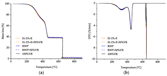 TGA measurements were performed on the VR blends under an argon atmosphere between 25 and 650 °C and an oxygen atmosphere from 650 to 900 °C at a 5 K/min heating rate using a TG 209 F1 Libra® from Netzsch GmbH (Selb, Germany). For the gas transition, an isothermal segment was used, with 5 min per gas at 650 °C.