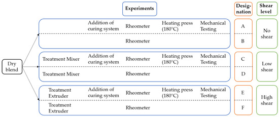An overview of samples with and without shear and the curing system are displayed in Figure 13. For the samples in the heating press (A), the curing system was added after the preparation of the dry blends. The mixtures consisting of RWP, DBD, and curing system were treated in the heating press at a temperature of 180 °C and 10 MPa for t90 time + 2 min. C and E were first devulcanized. Subsequently, the crosslinking system was added with the mixer, and then test plates were prepared in the heating press.