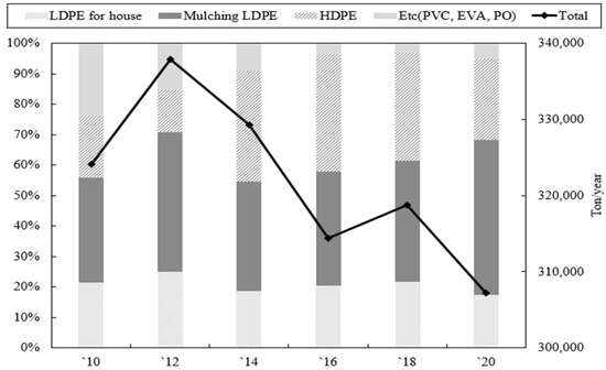 Figure 2 shows the generation amount of agricultural plastic waste and the generation rate by material. The generation of AWV was 307,159 tons in 2020, on a declining trend [25]. It is presumed that the number of farm households and illegal treatment due to an aging population had major impacts on the decline. By material, about 53,589 tons of LDPE for houses, 156,422 tons of LDPE for mulching, 81,517 tons of HDPE (High-Density Polyethylene), and 15,631 tons of other AWV (PVC (Polyvinyl chloride), EVA (Ethylene Vinyl Acetate), and PO (Poly Olefin)) were generated. HDPE is mostly used for multi-purpose applications; even foreign substances are counted in discharged AWV. In addition, considering that the discharge of AWV from other materials decreased by 80% (77,346 tons (`10)→15,631 tons (`20)), the aging of rural areas in Korea is progressing very rapidly (67%(`10)→79%(`20)), while there is a diminishment in the reduction in plastic use in farmland (0.44 ton/ha(`10)→0.41 ton/ha(`20). The abovementioned reason causes a decrease in agricultural plastic waste.