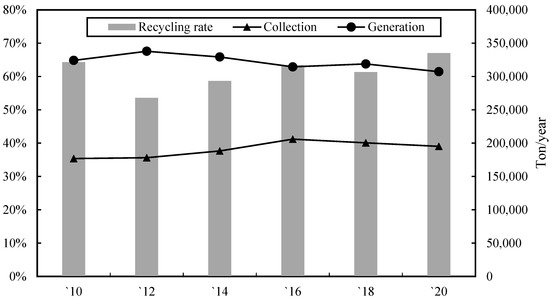 Table 2 shows result of cost to introducing EPR. An amount of USD 0.06/kg was provided for collection support, USD 0.09/kg was provided for recycling, and USD 0.01/kg was provided for cooperative and center operation costs, resulting in a total contribution of USD 0.16/kg. These costs are higher than the USD 0.04/kg previously paid to private collectors and are expected to contribute to the improvement of the collection rate.