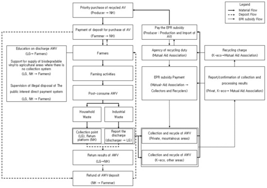 EPR would be more likely to be adopted by small–medium AV producers [34]. AV producers pay the EPR contribution for the produce and imported products. This system replaces the cost of existing public finances, thereby reducing the financial burden on the national treasury and strengthening the responsibility of producers. In addition, there are many problems with the quality of the recycled products of AWV. As such, there is a need to develop a technology capable of producing high-quality renewable materials from agricultural waste vinyl. There is a need to develop advanced recycling technology using the financial resources of the EPR system. Instead, a compensation system has been established that requires the NH to undergo compulsory purchases to promote resource circulation. In addition, to strengthen the management of illegal processing, local governments and the NH supervised illegal disposals and proposed a reward system for reporting illegal disposals, while the private sector reports the collection and disposal results.