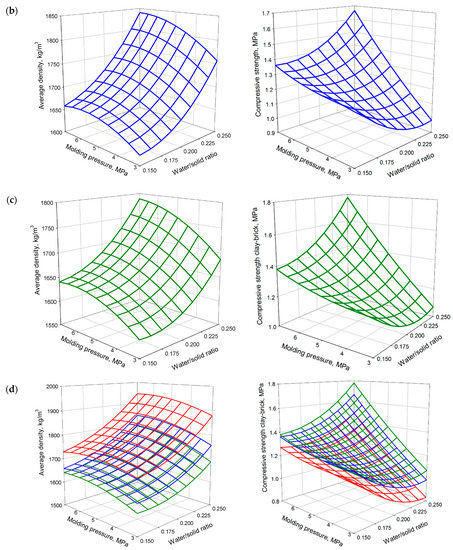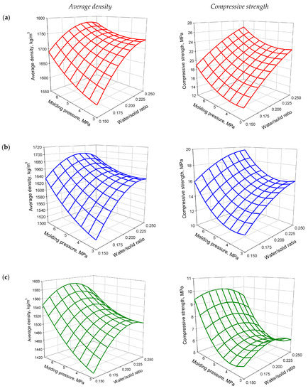 The choice of the range of values of molding pressure and, in particular, its upper limit (7 MPa), was determined by the technical characteristics of the enterprise equipment. A W/S ratio in the range of 0.15–0.25 was chosen, based on the analysis of literary sources [30,31,32,33].