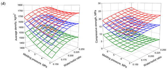 The effect of molding pressure and W/S ratio on the average density and compressive strength for samples at two days after demolding at different FCG contents in the raw mixture: (a) 10%; (b) 30%; (c) 50%; (d) combined nomogram.