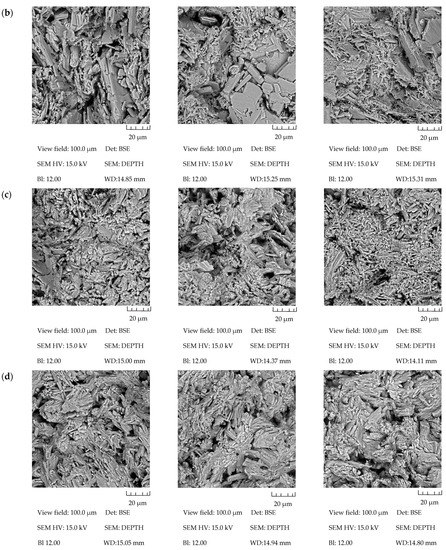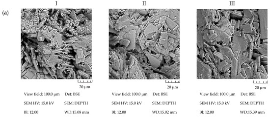 The microstructure of the reference mixes showed (Figure 3d) that the samples molded at the maximum W/S ratio of 0.25 and molding pressure of 7 MPa are the most homogeneous and compact (Figure 3dIII, mix 18). The lowest homogeneity and average density are typical for samples prepared at the minimum W/S ratio (0.15) and molding pressure (3 MPa) (Figure 5dI, mix 16), which is fully consistent with the physical and mechanical properties of the reference samples (Table 2). W/S values of 0.25 provide maximum CGB hydration, and also help to reduce wall friction, which together has a positive effect on the structure, compressive strength, and average density of the samples (Table 2 mix 18). At the same time, at W/S = 0.15, the amount of water becomes insufficient to provide CGB hydration, and the negative effect of wall friction also increases. Wall friction, as well as low molding pressure, lead to the formation of samples with a loose structure, and low compressive strength and average density, as a result (Table 2, mix 16).