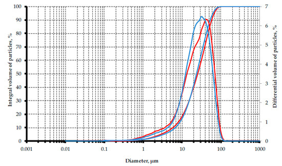 Granulometry of CGB and FGB is shown in Figure 4. CGB is characterized by a unimodal particle distribution, with a well-defined peak in the size range of 28–36 µm. The modal particle diameter is 30.1 μm. FCG is characterized by a unimodal particle distribution, with a well-defined peak in the size range of 36–46 µm. The modal particle diameter of FCG is 37.79 μm.