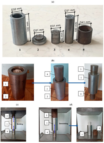 4. The press-tool was placed under the press plates and a pressure load was applied. Molding was carried out with a laboratory press under a molding pressure load of 10 tonnes. The sample was kept at a given pressure load for 30 s (Figure 5c). After releasing the pressure, the piston for molding 3 was removed from the press-tool and then the demolding ring 5 was placed. Then the mold was placed under the press plates and the sample was demolded from the press-tool. As a result, cylinders with diameters of 31 mm and heights of 31–39 mm, were obtained (Figure 2d).