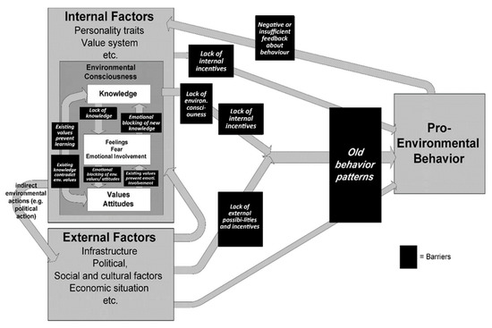 Kollmuss and Agyeman [27] proposed a comprehensive PEB model in one of the most cited works among pro-environmental studies. This model integrates knowledge, values, and attitudes with emotional involvement to form the ‘pro-environmental consciousness complex. This complex is embedded in broader personal values and shaped by personality traits and other internal and external factors. Social and cultural factors are classified as external factors, even though they could be considered a separate category that overlaps with internal and external factors. The various factors inherent in it and the synergies between them would play greater or lesser roles during the development process or at different stages in people’s lives. According to them, the greater the length of education, the more extensive the knowledge of environmental issues. However, increased education does not always imply increased pro-environmental behaviour. The model is characterised by arrows representing the numerous components interacting with one another. The wider arrow shows that the most substantial positive influence on PEB is produced when internal and external factors act synergistically. The black boxes highlight potential barriers to positive influence on PEB. Only a few of the most significant barriers are listed in the model. The largest one in the diagram represents old behavioural patterns. This is due in part to the fact that the barrier must block all three arrows. It is also because they want to draw attention to this aspect, believing that old habits form a formidable barrier frequently overlooked in the literature on pro-environmental behaviour. This model highlights the importance of knowledge, values, and attitudes in fostering pro-environmental behaviours. Figure 1 shows Kollmuss and Agyeman’s PEB model [27].