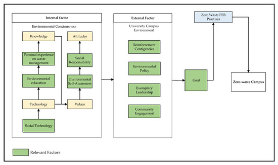 Ten relevant factors influencing a community’s sustainable pro-environmental behaviour towards a zero-waste campus have been identified and incorporated into the Zero-Waste Campus Framework, which was proposed in a previous paper for this research [19]. The proposed framework will be tested and verified further in this paper using the survey results. The relationships between knowledge, attitudes, values, and technology with zero-waste PEB practises are validated.