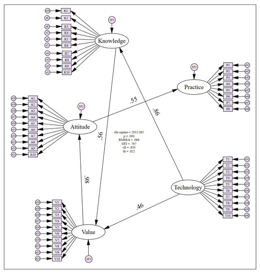 In the Zero-Waste Campus framework, relationships between studied variables are verified using Confirmatory Factor Analysis (CFA). The goodness of fit of the proposed framework was tested using CFA. CFA is the measuring component of SEM, which demonstrates the correlations between latent variables and their indicators. SEM is an effective method to analyse the correlation and causal relationship among latent constructs and observed variables, estimate the variance and covariance, test hypotheses, model conventional regression, and run the CFA [41]. CFA is a theory-driven alternative to traditional Exploratory Factor Analysis (EFA). The CFA allows items to be assigned to their respective factors and uses ‘fit statistics’ to evaluate whether the collected data are consistent with the hypothesised factor model. In this study, the variables knowledge, attitude, value, technology, and practise are considered latent constructs, which humans understand as concepts but cannot directly measure. Knowledge is commonly described as a true and justified belief. This definition has resulted in methods of measurement that rely solely on the correctness of answers. A correct or incorrect answer simply indicates that a person knows or does not know something [42]. However, it always comes down to measuring a score and converting that score into an estimate of knowledge, which may not be accurate if the answers to choose from, such as in multiple-choice questions, are provided. The university campus community’s knowledge, attitude, value, and practise, including the role of technology in SWM, cannot be measured directly, but their significance can be inferred by measuring observable variables. To determine the value of a latent variable, the observed variables are quantified, and a relationship between them and the latent variables is established. In CFA, model fit refers to how closely observed data match the relationships specified in a hypothesised model. The Kaiser–Meyer–Olkin (KMO) value for this study is 0.951, therefore the data is suitable for factor analysis. In SEM, several goodness-of-fit indexes reflect the model’s fit to the data. Currently, researchers cannot agree on which fitness indices should be reported. Cunningham et al. [43] and Hair [44] suggest using at least three fit indices, one from each model fit category. The three fitness classifications are absolute, incremental, and parsimonious, as shown in Table 1. The structural model of the study that met the three categories of model fit was adequate to represent the entire set of causal relationships.