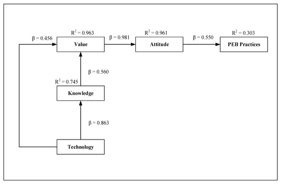 The results shown in Table 3 supported all the hypotheses of the direct effect model. Technology as the independent variable is a positive and significant predictor for knowledge (β = 0.863, p < 0.01) and value (β = 0.456, p < 0.01). Technology, particularly social technology such as social media, has the ability to convey messages and appeal to people’s emotions, persuading them to adhere to codified principles. According to research, 52% of the world’s turtles have consumed debris such as plastic waste [47]. This information is most likely being disseminated among academics and researchers. Only a tiny percentage of the community is aware of the problem. However, when the videos of sea turtles affected by plastic pollution circulated and were frequently shared on social media, they captured the attention of many people who later felt affected and wanted to do something to help improve the situation. In the context of SWM on campus, technology will enable the community to access environmental information, particularly on zero-waste, at the tip of their fingers. They will gain an understanding of the subject matter as a result of the easy and quick access to information. They can also distinguish between valid and invalid information shared on social media platforms, where social interaction helps balance the information technology provides. Dynamic discussion among community members will enable them to form opinions about the correct facts. Heartwarming videos, interactive information, and other media depicting environmental issues and information will attract the community members’ eyes and emotions more than words or texts alone can and will later instill values in the campus community members. Knowledge is a positive and significant predictor of value (β = 0.560, p < 0.01). Knowledge gained through education will bring out latent human values from within, transforming the individual into a good person with character [48]. A well-informed community will have reliable information, which will later become knowledge, influencing how they feel about the environment and building their inner belief in the matter. The result also shows that = value is a positive and significant predictor of attitude (β = 0.981, p < 0.01). Values and attitudes are two terms that are frequently used interchangeably but are distinct in their own right. University campus communities with strong values will influence their actions and behaviours towards the environment. For example, in the cafeterias around university campuses, single-use plastic is used for food packaging. Knowledge of the environmental effects of single-use plastic will raise awareness and instill a sense of value among the campus community. This was demonstrated by the hugely successful ‘White Coffin’ (Styrofoam food containers) and ‘Say No to Plastic’ campaigns at USM in 2008, which spread to other universities and spawned a follow-up activity known as ‘Tapau-mania’. This programme encourages students to bring reusable containers to campus to pack food from cafeterias. Since January 2011, it has also influenced the Penang state government to implement a ‘No Plastic Bag’ policy [49]. The values instilled in the community influenced their attitudes and encouraged them to participate and act. This is supported by the study’s findings, which discovered that attitude is a positive and significant predictor of zero-waste PEB practises (β = 0.550, p < 0.01), which will encourage sustainable zero-waste practises among the community members. Knowledge, values, attitudes, practises, and the role of technology in promoting zero-waste are all significantly associated.