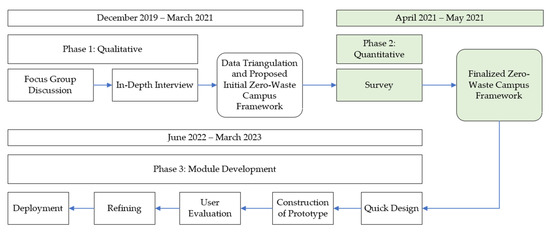 This study used an exploratory mixed-method design [50]. An initial qualitative phase included focus group discussions and in-depth interviews to investigate the main and relevant factors that influence the pro-environmental behaviour of the university campus community. The findings from the qualitative phases are then triangulated to develop the survey instrument. The finding is also being used to propose an initial zero-waste campus framework. This was followed by a quantitative phase, which will be discussed in this paper, which explored the university campus perspective from a broader perspective using a larger sample. The survey results are used to finalise the proposed framework to help promote environmental sustainability through pro-environmental behaviour on a zero-waste campus. The findings from both phases are then used to develop a prototype for a Zero-Waste Campus digital module. The flow of the study is illustrated in Figure 7.