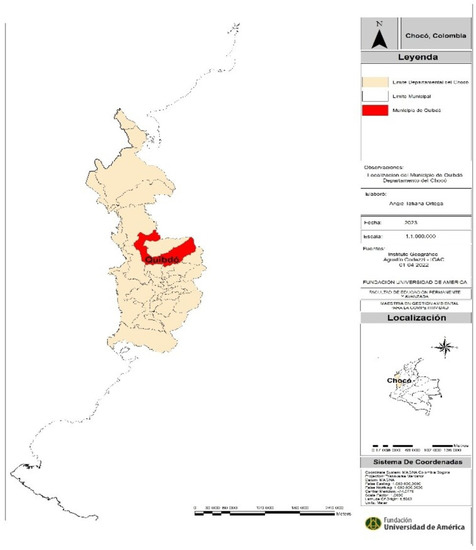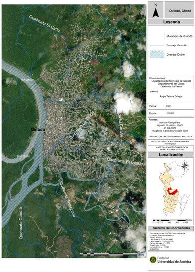 The area object of this investigation is the Municipality of Quibdo, capital of the department of Choco, located in the central and eastern zone of said department, as shown in Figure 1. It has a height above sea level of 43 m, an average temperature of 28 °C [10]. Currently, the Municipality of Quibdo has 129,237 populations [11].
