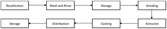 Another product proposed for elaboration are the double crochet, whose dimensions are 9 cm × 4 cm × 300 cm, for which it is required to use 8.04 kg of raw material, allowing the manufacture of 18.5 kg posts based on the plant of 8 h a day for 6 days a week is proposed. Figure 4 shows the manufacturing flow chart of plastic wood.