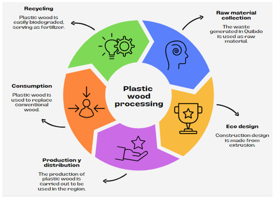 It is important to understand that the production processes must be based on a principle of the circular economy, that is, reduce, recycle, reuse and revalue each of the resources that are going to be used, being a sustainable process as evidenced in Figure 9. For this case, four collection channels were defined: Alliance with the Quibdo Recyclers Association, Community Participation, Municipal Mayor’s Office and the community and the public cleaning service in order to develop plastic wood from waste.