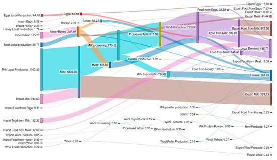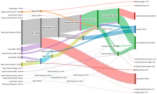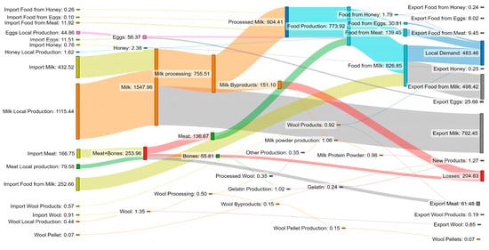 The baseline scenario’s outcome is represented by the flows taken from statistic databases and used as input data for the model with a correct mass balance. The bioresource flows for the base year 2015 are revealed in the Sankey diagram (see Figure 1). The amounts of material input criteria are fixed to show a historical perspective of the livestock sector. This shows that the biggest part of the obtained animal products in mass units consists of locally produced and imported milk, locally produced meat, and eggs. Wool and honey obtained in the examined mass units make up a small part of the total volume of animal products. The largest part of the milk and food produced from milk is exported, and a noticeably big part of the products produced is used for local consumption with some losses (mostly from milk production).