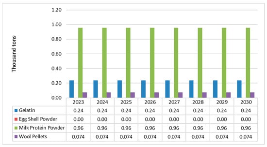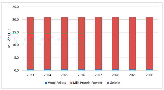 The model reaches the limits (e.g., the capacity of resource application, economic viability, and demand limit) of available resources for milk protein powder and gelatin; thus, the same amount is produced every year. Protein powder and gelatin reach the available resource limits immediately in 2023, and, therefore, their production is constant. As for the wool pellets, all of the wool resources available are used to produce wool pellets. The forecasted demand for pellets, on the other hand, is 58.37 thousand tons. The pellets produced are only about 0.1% of this demand value. If forecasted demand values were removed, then all added value would be covered by milk protein powder.