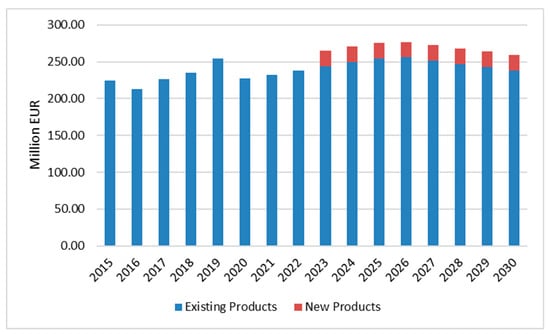 Even after introducing new technologies, the desired result of the complete use of by-products has not been achieved yet in any scenario because of local market limitations. However, it can be observed that trends calculated by the model show an increase in local and imported commodity volumes in 2023 and 2030 compared to the base year 2015 while having a decrease in total material losses. Although only part of the by-products was used in the production of the new products, their economic contribution over the 7-year period is noticeable. When introducing new technologies, the cumulative added value is calculated to exceed the set goal of a 30% added value increase in bioresources in 2030 by more than two times (62%) in years 2023–2030 in the case where these technologies are introduced starting in 2023 (see Figure 2).