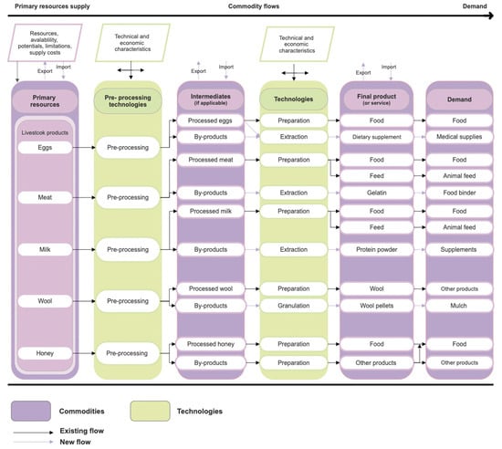 For further development of the bioeconomy, it is relevant to expand biorefineries, as this is the multifunctional system that turns biomass into beneficial products []. Biorefineries depend on the amount of feedstock produced that can be used to produce higher-added-value by-products []. The research on scenarios for the development of biorefining and valorization of bioresources is helpful in bioeconomy policy planning. It is essential to evaluate the divergent aspects linked to the implementation of biorefineries prior to setting national bioeconomy goals for specific added value thresholds. Thus, the main aim of the research is to evaluate the contribution of animal husbandry bioresources to the development of bioeconomy on the national scale. Although agriculture plays a huge role in any economy, especially because it produces essential goods and demand is constantly growing, the growth of the agricultural sector lags slightly behind the growth of other sectors, as its potential is underutilized—currently, it is very important to increase not only productivity but also the added value of agricultural products. Moreover, this is very characteristic of agriculture not only in Latvia but throughout Europe []. Currently, it is also important to pay attention to the livestock sector of agriculture in Latvia because of its lower profitability compared to plant cultivation. Thus, the aim of this study is to discover the least costly solution to achieve 30% added value in the animal husbandry sector of Latvia in 2030 with the help of new products with higher added value, which are produced from current product residuals. The added value goal of 30% by 2030 (compared to the value in 2015) was selected as a very high and challenging target within the research project “Bioresource Value Model” funded by Latvia’s state budget Fundamental and Applied Research Project. Such a high target would reveal the pathways for a rapid increase in the value of the bioeconomy and bioresources. The novelty of the developed model for the purpose of the study lies within the fact that, to date, there is no empirical evaluation tool that allows researchers to study the impact of new technologies on the national bioeconomy. Moreover, there is no clear economically viable pathway set for the valorization of specific agriculture residual products.