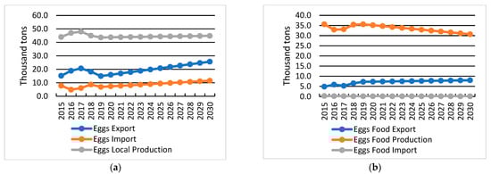 In the egg market in Latvia, the number of eggs laid is constantly increasing, and more is produced than is needed for the local market, so a large part is exported. The extrapolated statistical data presented in Figure 9 are used as input for the model. In Figure 9b, the forecast shows that a significant drop in domestically produced egg produce (processed products) can be expected, while the import of egg products remains constant.