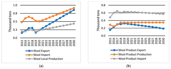 The input data for wool (raw) used for the model are shown in Figure 11. According to the statistical data analysis and trend extrapolation, exported wool is rising rapidly, while the amount of exported wool products with higher added value is falling rapidly. Although wool imports are growing rapidly, the demand for wool product imports is forecasted to decline. Domestic wool production, on the other hand, is slowly growing, while production volumes of domestic wool products remain constant.