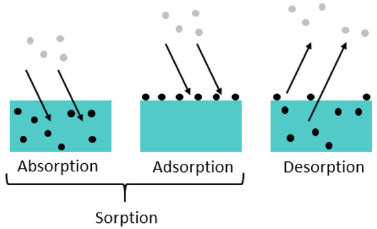 28]): Sorption is a generic term and describes the accumulation of a particular substance in (i.e., absorption) or on (i.e., adsorption) another medium. Desorption is the reverse process, where the molecules of the dissolved substance leave, for example, the surface of a solid or the liquid in which they were dissolved.