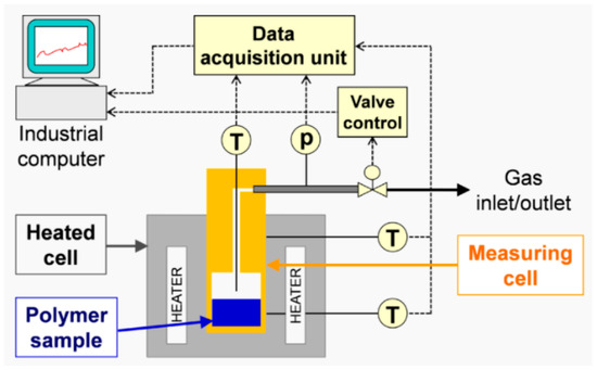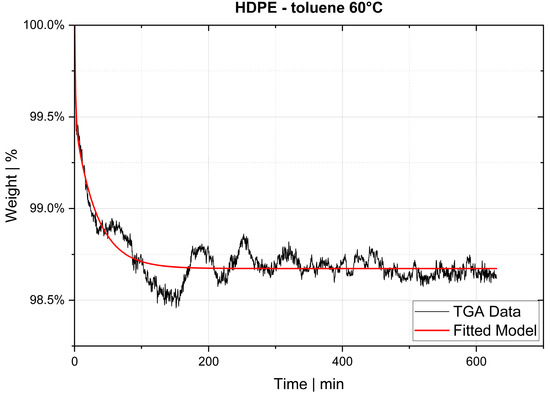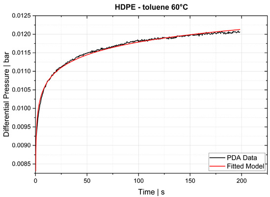 25]. However, reproducing these experiments is difficult because the exact measurement conditions and the experimental procedure are in most cases poorly documented. Even the concentration of the substance in the sample depends on the test environment, as the equilibrium state is a function of, for instance, temperature and pressure. Rather than validating the TGA method by using the literature values, we took a different approach by applying a second experimental method. First, the TGA method was validated with experimental results obtained from a pressure decay apparatus (PDA). For this purpose, samples of high-density polyethylene (HDPE) and polypropylene (PP) were prepared and saturated with toluene. The same samples were used in both methods. The results of the PDA served as a reference value for the TGA. After successful validation, TGA was used to determine diffusion coefficients of post-industrial PP recyclates in the melt phase.