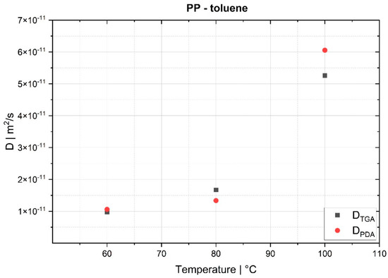 29]. To determine the diffusion coefficient, both methods we employed (TGA and PDA) use Fick’s second law, which describes the relationship between local and temporal changes in the concentration of a substance and states (see Equation (1)) that the dispersion of a gas or liquid is proportional to the spatial concentration gradient of that substance. The proportionality factor is called the diffusion coefficient (