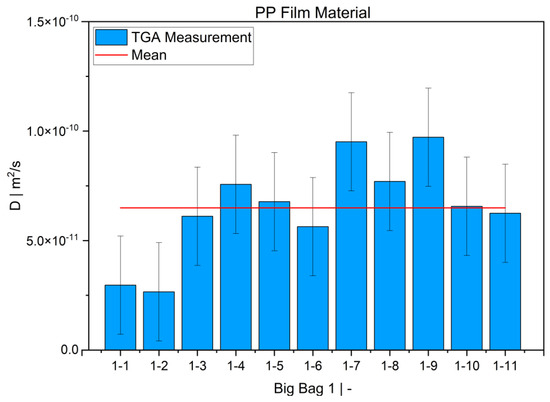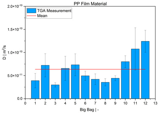 TGA was used in this study to determine the diffusion coefficient in the melt of plastic waste material at 220 °C. Care was taken to ensure that the measurements were statistically representative. All 12 big bags contributed material to the 36 TGA measurements carried out, from which the mean value was then determined. Overall, the standard deviations were low, thus indicating the reproducibility of the measurements. For big bag 1, 8 additional measurements (11 measurements in total) were taken to confirm the normal distribution of the TGA measurements in one big bag.