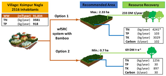 The recommended maximum land requirements are calculated as 9.3 m2/PE for bamboo, 17.1 m2/PE for willow, and 25.7 m2/PE for poplar wfSRC systems. The minimum and maximum specific land requirements for each plant were then used to calculate the potential size of the wfSRC for each village in the study region. Then, the biomass yield was estimated using the measured values at the pilot plant and the estimated land requirements. The recovery rate of nitrogen, potassium, and phosphorus, and the potential for carbon sequestration were also estimated for each settlement and for the entire region based on average concentrations measured in the biomass samples at the pilot plant.