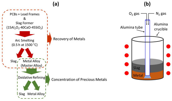 WEEE materials are known to contain precious metals such as gold (Au), silver (Ag), and the platinum group metals (PGMs), which possess superior characteristics including high melting points, corrosion resistance, and excellent electrical conductivity [12,13]. The recovery of these precious metals not only helps to preserve valuable resources but also reduces the need for extracting virgin ores, thereby mitigating the environmental impact associated with conventional mining practices [14,15]. Pyrometallurgical recycling processes have been considered as highly effective methods for the recovery of valuable metals from WEEE [16,17,18]. This approach utilizes high-temperature thermal processes to extract and separate metals from electronic waste, providing an efficient and reliable means of metal recovery [19,20]. Valuable metals such as copper (Cu), gold (Au), silver (Ag), palladium (Pd), and platinum (Pt) can be successfully recovered from complex electronic waste streams using pyrometallurgical techniques [21,22,23,24].