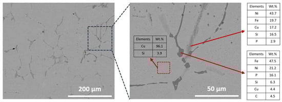 Figure 2 shows the microstructures of the master alloy along with the EDX results, revealing the distribution of impurities within the Cu-rich grains. The Cu-rich grains contained a small amount of Si (4.20 wt%), which is expected to be removed during the oxidative refining process. Along the grain boundaries, two phases were observed, represented by dark gray color, as shown in Figure 2. The phase with a darker gray color was composed of a high quantity of Fe, while the other phase, richer in Ni, appeared with a lighter gray color. These Fe- and Ni-rich phases also contained other impurities such as Si and P. Although precious metals were present in very small quantities in the WD-XRF result, they were not detectable through EDX analysis.