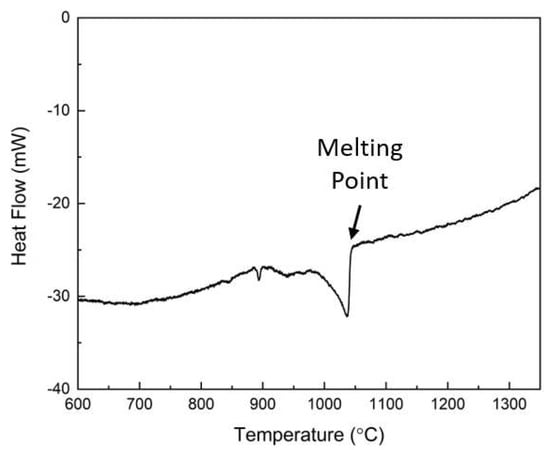 To investigate the thermal behavior of the master alloy, DSC analysis was performed, and the results are shown in Figure 3. During the heating process, a significant endothermic peak was observed at temperatures above 1000 °C, indicating a characteristic melting reaction. This observation confirmed that the melting point of the master alloy is 1046 °C. Consequently, it was determined that the process temperature for the oxidative refining needs to be set within a higher temperature range to ensure proper processing of the master alloy.