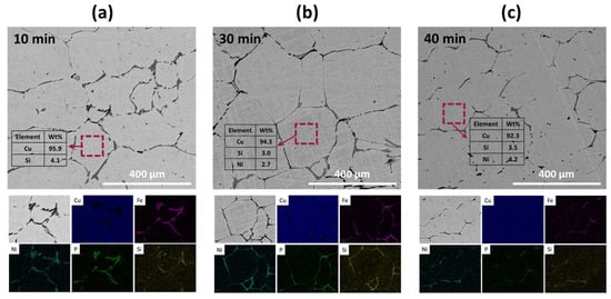 SEM micrographs and EDX mapping and elemental analysis including Cu, Fe, Ni, P, and Si of refined metals depending on the refining process time for (a) 10 min, (b) 30 min, and (c) 40 min. Patterns of EDX analysis can be found in Figure A2.
