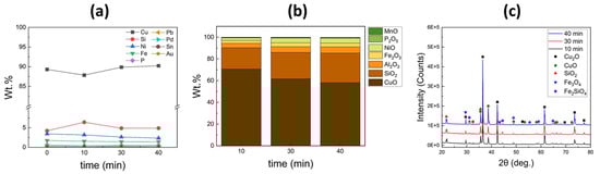 XRF analysis was performed to analyze the composition of the metals and slag obtained after the refining process. Figure 5 presents the results of the XRF analysis, with (a) and (b) representing the analyzed results of the metals and slag, respectively. The metals were primarily composed of Cu along with impurities and precious elements. After a 10-min process, there was a slight increase in Cu content accompanied by an increase in Si content. This suggests that, initially, Cu oxidation was the dominant process. As the process time increased, the Cu content showed a slight increase while the Si content decreased. Impurities such as Fe, Ni, and P exhibited a continuous decrease over time. However, even after a 40 min process, the impurities were not completely removed, and the contents of precious metals (Pd and Au) did not exhibit significant changes. Regarding the slag layer, copper oxide (CuO) was predominantly formed during the initial 10 min of the process. Subsequently, the content of other oxides, such as silicon oxide (SiO2), aluminum oxide (Al2O3), iron oxide (Fe2O3), and nickel oxide (NiO), started to increase, and their mass fraction rapidly increased over time.