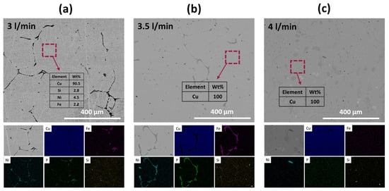 The micrographs and EDX results of the refined metals are presented in Figure 6. In Figure 6a, which corresponds to the metals refined with a gas flow rate of 3 L/min, similar observations to those discussed in Figure 4 were made. Black and dark gray phases, indicative of Fe-rich and Ni-rich phases, respectively, were observed along the Cu grains. Additionally, the Cu grains contained small amounts of impurities such as Si, Ni, and Fe. Conversely, in the sample refined with a gas flow rate of 3.5 L/min, no other elements were detected within the Cu grains. The volume fractions of Fe-rich and Ni-rich phases along the Cu grains were significantly reduced, with no distinct separation between the two phases. Furthermore, when the total flow rate was increased to 4 L/min, Fe-rich or Ni-rich phases were barely observed, and no impurities were detected within the Cu grains. Therefore, the increase in gas injection pressure effectively decreased impurities such as Fe, Ni, Si, and P.
