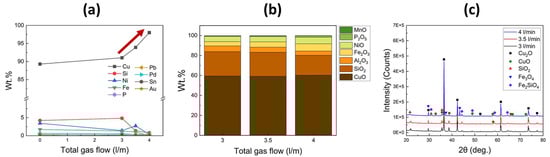 SEM micrographs, EDX mapping, and elemental analysis of recovered metals after refining process with a total gas flow rate of (a) 3 L/min, (b) 3.5 L/min, and (c) 4 L/min. The analysis includes Cu, Fe, Ni, P, and Si elements. Patterns of EDX analysis can be found in Figure A3.