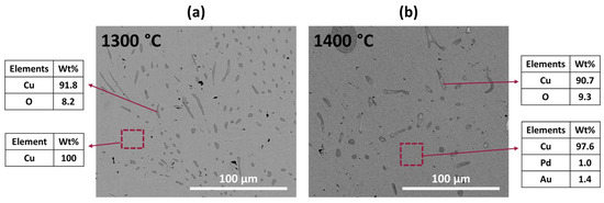 The microstructure and EDX results of the recovered metals are presented in Figure 8. As shown in Figure 8a, the EDX measurement detected only Cu in the recovered metal after refining at 1300 °C. However, for the recovered metal refined at 1400 °C, in addition to Cu, significant amounts of Pd and Au were observed through EDX analysis, as shown in Figure 8b, indicating the remarkable concentration of precious metals within the recovered metal. This observation highlights the effectiveness of the refining process at 1400 °C in enriching the recovered metal with valuable Pd and Au. No other phases, such as Fe-rich or Ni-rich phases, were observed, while Cu oxides were formed and distributed within the Cu matrix phase.