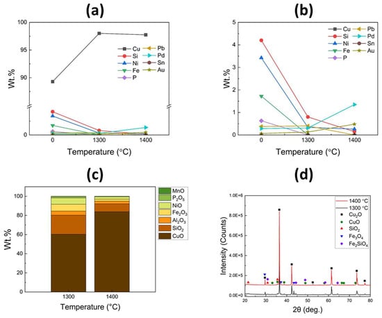 Figure 9a presents the XRF analysis results of the recovered metals from the refining process, while an enlarged image is displayed in Figure 9b. Upon refining at 1300 °C, a significant increase in Cu content was observed, indicating successful reduction in impurities such as Fe, Si, Ni, P, and Pb, which oxidized and were separated into the slag layer. Furthermore, there was a slight increase in the contents of Pd and Au, from 0.28 to 0.31 wt.% and from 0.06 to 0.13 wt.%, respectively. When the refining process was conducted at 1400 °C, the impurity levels were further reduced and nearly eliminated, reaching below 0.5 wt.%. In contrast, the contents of Pd and Au exhibited substantial increases, reaching 1.35 and 0.48 wt.%, respectively. In the slag layer, the content of Cu oxides significantly increased after the refining process at 1400 °C, as shown in Figure 9c. This finding is consistent with the XRD results presented in Figure 9d, which indicate the predominant development of diffraction peaks corresponding to the Cu2O phase with high intensities. Consequently, these results support the conclusion that the Cu melt at higher temperatures can undergo facile oxidation due to its lower viscosity.