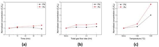 Normalized concentration (Cr/C0) of Pd and Au calculated based on the ICP analysis results, depending on (a) process time, (b) total gas flow rate and (c) process temperature. C0 represents the concentration of the master alloy, while Cr represents the concentration of the recovered metal after the refining process.
