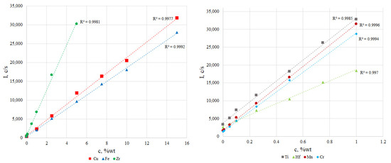 The selection of conditions depends on the height of the analyte’s signals. Too strong intensities (more than 30,000–40,000 impulses per second for this spectrometer) lead to detector miscalculations and peak distortion. For Sm, Co, Fe, and Cu, the lines were chosen in the second reflection order of the C002 crystal analyzer where there are slightly lower intensities. It is better to set low current values (0.2 mA) and a measuring time of 40 s for these lines to collect statistics. This decreases the standard uncertainty of calibration and leads to more accurate calibration curves. In the case of low impurity levels, it is recommended to increase the current (3.5 mA) and the measuring time (50 s) to raise the sensitivity. The line chosen for the titanium determination is sufficiently intense; therefore, an exposure time of 40 s and a tube current of 0.5 mA were chosen.