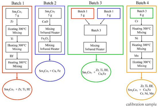 The treatment by solutions provides sufficiently high homogeneity of impurity-elements distribution. At the same time, there are practically no problems with controlling impurities imported with reagents during synthesis. Calibration sample preparation consisted of 4 steps, which resulted in 4 batches of Sm2Co7 powder with added impurities (Figure 2). The suspensions were taken using laboratory scales VL-224V (permissible measurement uncertainty 0.005–0.015 mg).