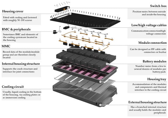 The structural design of the battery system and the joint connections are of decisive importance for the effort required for a disassembly task []. Even if battery packs generally have a similar functional design, the number, shape, and position of the individual components, as well as the joints used, can vary greatly [,]. Figure 2 shows a general battery pack structure together with details of the individual components.