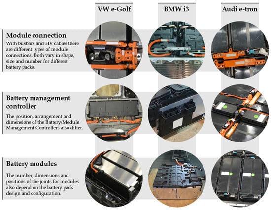 To underline some concrete differences between functionally equivalent components, Figure 3 shows the module connections, battery/module management controllers, and battery modules from the battery systems of the VW e-Golf, BMW i3, and Audi e-tron vehicle models.