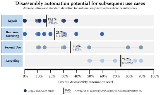 The classification by the experts basically shows that the greatest potential for automation is seen for a subsequent recycling use case with an average of 74.2%. This is particularly due to the fact that in this scenario the individual process steps of dismantling must not only be carried out non-destructively. In addition, the recycling process routes in scaled stages are significantly more dependent on a continuous supply of input material streams, which in turn increases the need and, therefore, the potential for an automated dismantling process in this constellation []. However, the experts do not assume a complete process automation in this use case either, mainly due to the current product design structures and their joint connections.