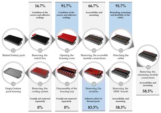 In principle, each dismantling process is individually dependent on the battery model under consideration and can also differ again due to the condition of the individual battery system. Nevertheless, basic dismantling activities can be identified that are available for a large number of battery systems and can be put into a general sequence []. On the basis of this process flow shown in Figure 6, the experts’ assessments made it possible to identify individual activities with particularly high difficulties.