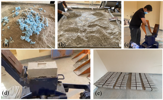 (a) Mixing of ingredients, (b) homogenous mix, (c) brick pressing, (d) prepared bricks, (e) ambient curing [32].