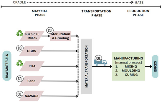 The construction sector should make a great effort to contribute towards the goal of carbon neutrality set by the nations of the world [28]. At the same time, the shift from a linear to a circular economy model has provided an opportunity to recycle plastic waste in the construction industry [29]. One of the approaches for low-carbon emissions is to improve the performance of construction materials [30], and plastic waste can play a catalytic role in improving the material’s properties and performance [31]. However, the use of waste surgical masks in alternative geopolymer bricks has not been extensively studied, and there are many gaps in terms of the properties of such construction materials, as discussed by the authors in their recently published article [32]. Therefore, this study is undertaken to further enhance the understanding of such materials from a sustainability perspective and contribute towards circular economy approaches in the construction industry.
