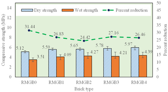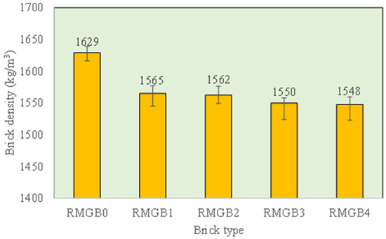 The results of the compressive strength are shown in Figure 3. The addition of RSM enhanced the dry and wet compressive strength of the geopolymer bricks. For instance, the increase in mean dry compressive strength after 28 days of curing was 9.17%, 10.3%, 12.9%, and 16.6% for RMGB1, RMGB2, RMGB3, and RMGB4 when compared to RMGB0, respectively. The wet compressive strength of the geopolymer bricks was tested by subjecting the samples to axial compression after soaking them in water for 24 h. The wet compressive strength improved with the addition of RSM, such that the increase in the mean wet compressive strength after 28 days of curing was 16.5%, 21.6%, 20%, and 25% for RMGB1, RMGB2, RMGB3, and RMGB4 when compared to RMGB0, respectively. Additionally, the percent reduction in wet compressive strength when compared to dry decreased with the addition of RSM. The results of the flexural strength are presented in Figure 4. As seen, the addition of RSM improved the dry and wet flexural strength of the geopolymer bricks. The increase in mean dry flexural strength after 28 days of curing was 39.13%, 31.3%, 37.4%, and 40.86% for RMGB1, RMGB2, RMGB3, and RMGB4 when compared to RMGB0, respectively. The wet flexural strength improved with the addition of RSM, and the increase in mean wet flexural strength after 28 days of curing was 56.89%, 50%, 79.3%, and 68.9% for RMGB1, RMGB2, RMGB3, and RMGB4 when compared to RMGB0, respectively. Further, the percent reduction in wet flexural strength of bricks when compared to dry decreased with the addition of RSM. It was observed that the brick specimens with a 4% addition of RSM showed the best performance with respect to strength when compared to other specimens. Such findings clearly depict the influence of RSM fibers in resisting the forces in the bricks. According to a previous study [20], the addition of polypropylene fibers restricts crack growth and improves load-carrying capacity. Besides, PP fibers have shown a positive influence on the mechanical properties of geopolymer composites [41]. Figure 5 represents the variation in the density of the different brick samples. It was observed that the addition of RSM was instrumental in reducing the self-weight of bricks by 3.92%, 4.11%, 4.84%, and 4.97% for RMGB1, RMGB2, RMGB3, and RMGB4 in comparison to RMGB0, respectively. The reduction in density is attributed to the lower specific weight of RSM. The reduction in the density of geopolymer composites with the inclusion of PP fibers has also been reported in the past [42]. Such a reduction in density, without a compromise in the strength of the bricks, makes it useful in structural and non-structural elements in bringing down their dead weight. Moreover, this will benefit tall buildings by improving the structure’s performance and service life. All things considered, it is clear that RSM fibers will positively influence the strength of geopolymer bricks, and this enhancement is significant. Therefore, from the results obtained, RSM should be considered a sustainable additive in construction materials; this is because it aids in augmenting the material efficiency due to improved properties of the RMGB, and further, this will contribute towards lower carbon emission in the long span of the building’s service life [43].