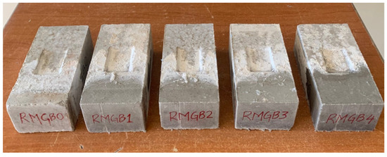 The effective use of RHA in the construction industry can achieve sustainable practice [33]. Recently, several studies have reported its positive influence in developing alkali-activated binders [34]. According to Mehta and Siddique [35], the inclusion of 5–15% RHA in GGBS improved the compressive and tensile properties of alkali-activated binders. Similarly, Venkatesan and Pazhani [36] reported improved strength and durability properties for 10% RHA replacement with GGBS. Therefore, in this study, the geopolymer binder was proportioned with 85% GGBS and 15% RHA of the total binder content. Further, manufactured sand was used to improve the workability and to reduce the shrinkage in the mix [37]. The total quantity of sand was decided based on initial laboratory trials and it was fixed at 30% by the total weight of the solid fraction. To activate the solid precursors, Na2SiO3 sol. was added, and the total quantity was fixed at 8% based on the previous study [38]. There was a need for additional water to achieve the desired consistency for the mix, and this was set at 10% based on initial laboratory trials. The RSM was added based on the volume fraction of the mix, and it ranged from 0% to 4% in increments of 1%. The types of bricks evaluated are presented in Table 1. The respective densities (i.e., GGBS = 1340 kg/m3, RHA = 620 kg/m3, sand = 1955 kg/m3, RSM = 100 kg/m3, Na2SiO3 = 1593 kg/m3, and water = 1000 kg/m3) were used to determine the final weight fractions of each constituent, as presented in Table 2. For example, the determined unit weight of RSM was 100 kg/m3, and to obtain 4% RSM in the bricks, the calculation was (× 100), which resulted in 4 kg/m3 of RSM in the bricks. As seen, most of the constituents remained constant, except for RSM, which varied from 0% for RMGB0 to 4% for RMGB4; here RMGB denotes recycled surgical mask geopolymer bricks.